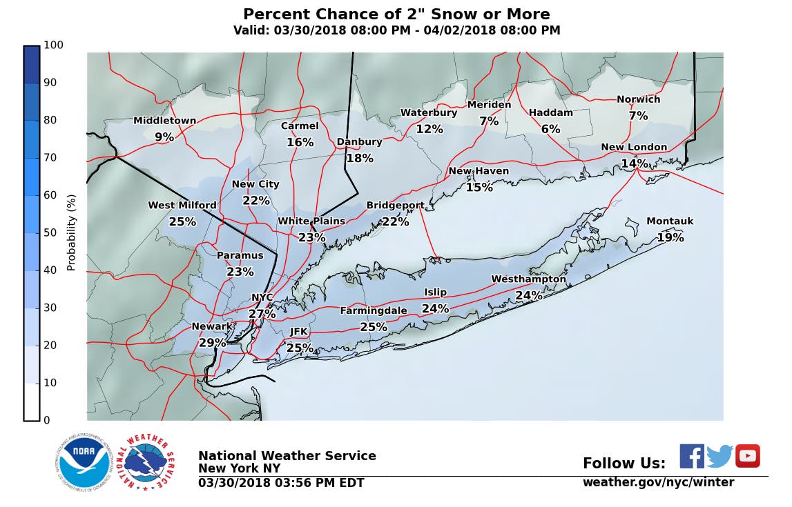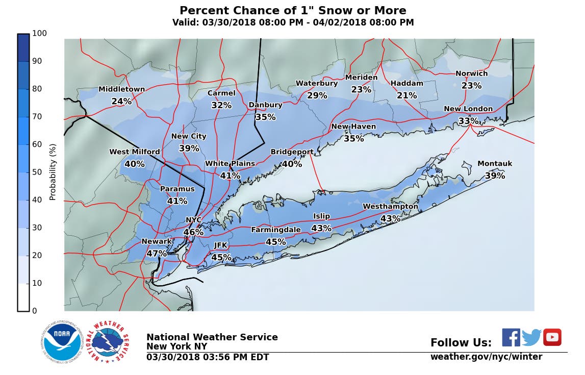 There's about a 30-40 percent chance of more than an inch of snow accumulation the lower Hudson Valley, according to NWS snow total estimate maps.