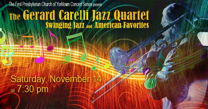 The First Presbyterian Church of Yorktown Concert Season kicks off its fifteenth season on Saturday, November 14th at 7:30 p.m. with a concert featuring the Carelli Jazz Quartet. Trombonist/Vocalist Gerard Carelli and his Quartet featuring son Marcello on drums performs swinging jazz and American popular standards. The concert will also feature the talented 16 year old drummer and percussionist Marcello Carelli. Don’t miss this toe tapping, classy, and classic, immensely entertaining evening of jazz favorites! 2880 Crompond Road, Yorktown Heights, NY. For more information see www.fpcyorktown.org.