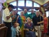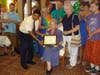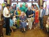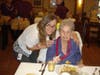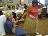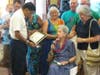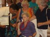 They all participated in a Luau-themed luncheon, complete with flowers, Hawaiian leis, and Hawaiian food. After lunch, Keller's sons, Chris and Lee, played music for the crowd and everyone had birthday cake.