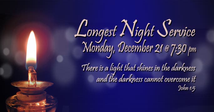 Join the First Presbyterian Church of Yorktown on Monday evening, December 21st at 7:30 p.m. for the Longest Night Service in preparation for the Light coming into the world on Christmas morning. Sometimes known as “Blue Christmas” and traditionally held on the longest night of the year, this beautiful candle-lit worship service offers hope, support, prayer and quiet reflection to those for whom the Advent season may also bring sadness, grief, and worry. Please join us for this peaceful and comforting worship which provides solace and hope for the Light which is coming.