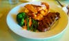 The 10-ounce strip steak and fried jumbo shrimp platter was served with small sides of vegetables and wedge-cut French fries. We were not asked for a preference on the temperature of the steak but it was served medium-well. The steak was well-cooked and tender. The unseasoned French fries were completely over-taken by the broccoli and green beans which were soaked in butter.