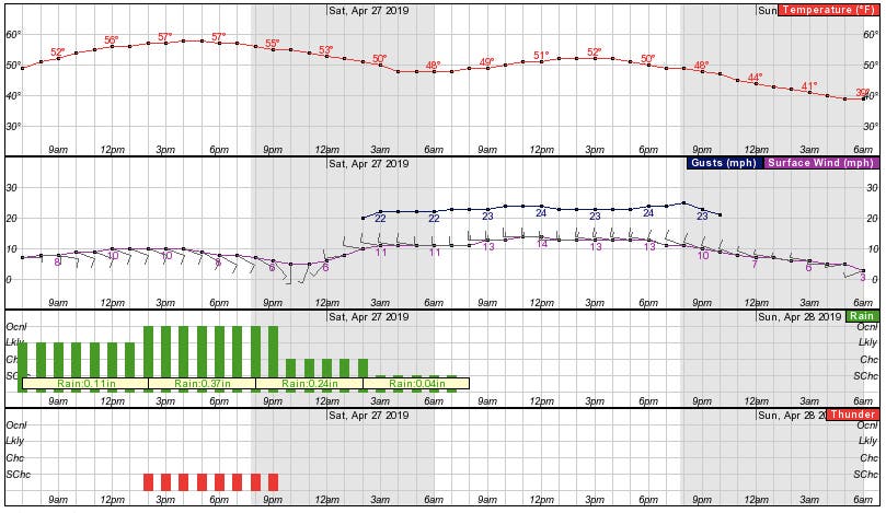 - Friday Night: Showers and possibly a thunderstorm before 10pm, then a chance of showers. Low around 47. Southeast wind 5 to 11 mph becoming west after midnight. Winds could gust as high as 22 mph. Chance of precipitation is 80%. New precipitation amounts between a quarter and half of an inch possible.