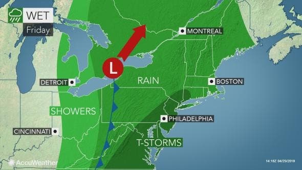 A thunderstorm is possible Friday evening, but showers will be tapering off in the overnight hours. The lows around the region will be in the low to mid-40s.