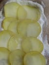 - Remove dough from oven and add ricotta cheese and sliced potato on top of pre-cooked dough.