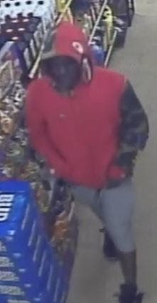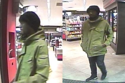 In Tuesday’s robbery, surveillance video shows him wearing a red hooded jacket and light grey pants. In Wednesday’s robbery, he was wearing a blue hoodie with a zipper in the front, black track pants and black shoes with a white outline on the soles that extended up the side of the shoes.