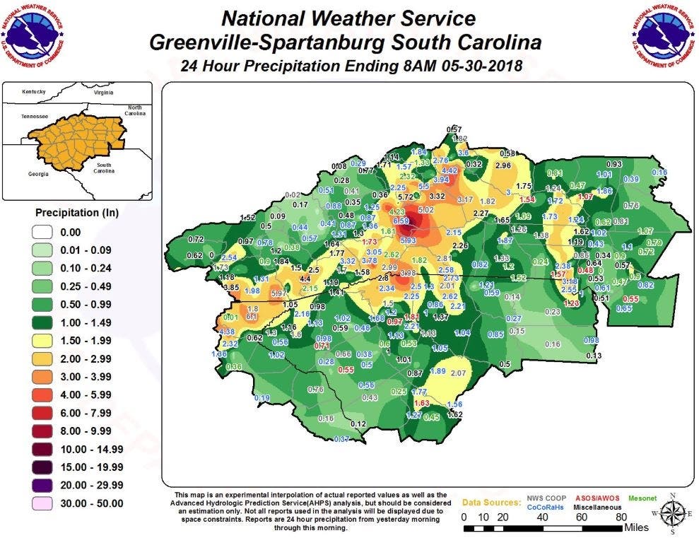 More than six inches of rain fell in western North Carolina May 29, with more rain expected Wednesday, the National Weather Service said. Flash flood warnings were issued in Buncombe, Henderson, Polk, Rutherford, Burke, Caldwell and McDowell counties, according to North Carolina Emergency Management. By early Wednesday morning, rising water prompted an evacuation order in McDowell County, which lies about two hours northwest of Charlotte.