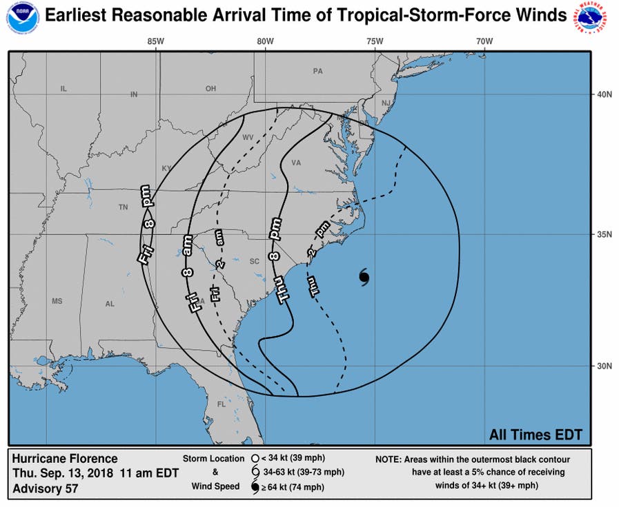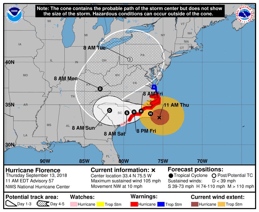 By Thursday morning, Florence was downgraded to a Category 2 storm, with sustained winds of 110 mph, according to the National Hurricane Center. By 8 p.m. Thursday, those winds had dialed back to around 100 mph, as it slow churned about 85 miles east-southeast of Wilmington, and about 145 miles east of Myrtle Beach, S.C.