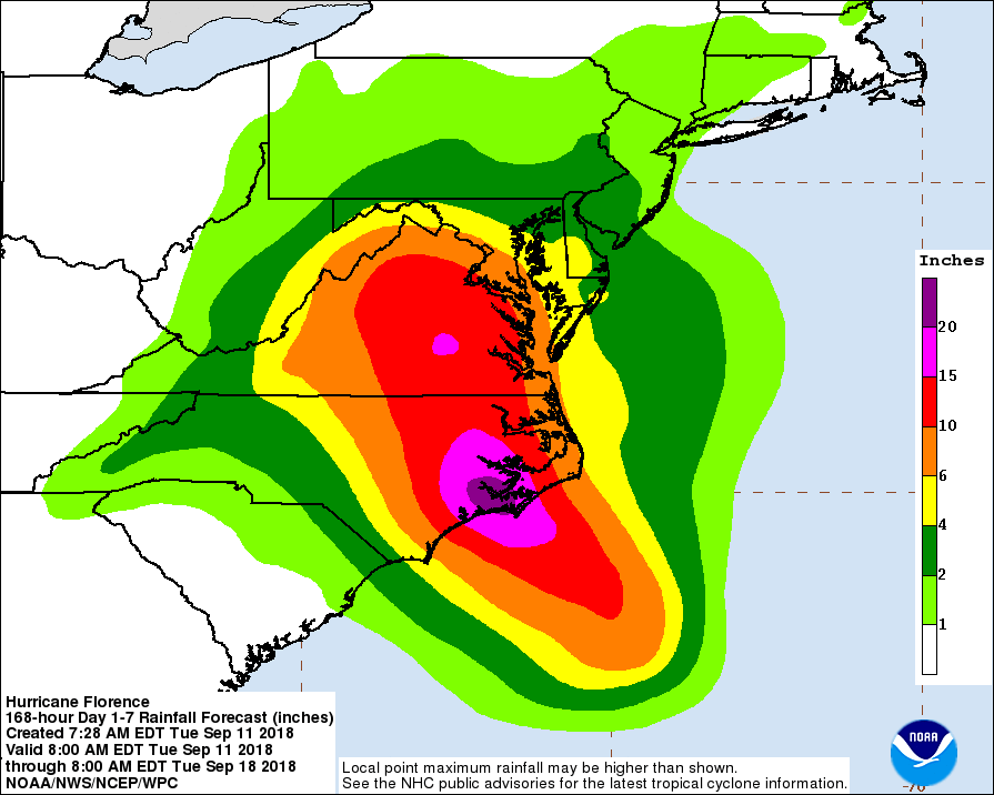 Tues morn #FlorenceNC update: * Get ready NOW! * Life-threatening impacts possible * Dangerous storm surge Thurs-Sun. 3-12' * Flooding inland. Eastern NC 15-20"; central NC 6-15" * Storm surge /Hurricane Watch for all NC coast * Dangerous winds will down trees & knock out power pic.twitter.com/puIu6X7aeT