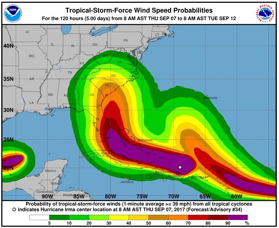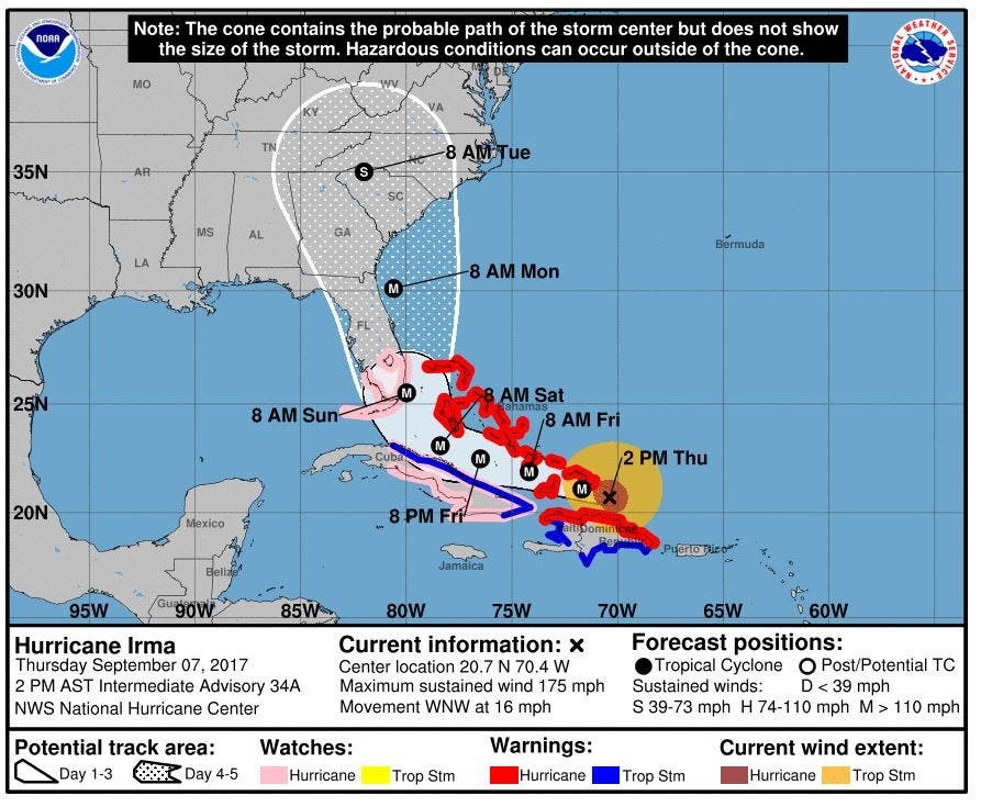 The 2 p.m. forecast released by the National Weather Service Thursday shows the Carolinas will begin to feel the tropical storm-force winds of Irma by Monday, Sept. 11, with the center of the storm bringing sustained winds up to 73 miles per hour to the upstate of South Carolina and the Charlotte metro region by Tuesday morning at 8 a.m.
