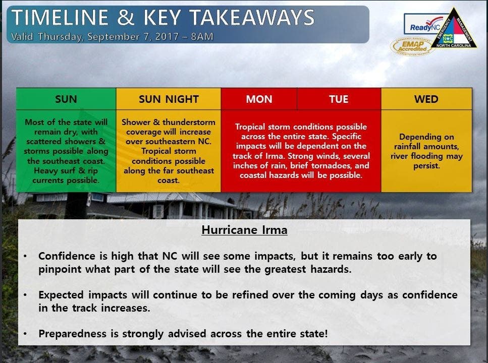Hurricane Irma will likely be downgraded to a tropical storm by the time it reaches North Carolina, forecasters said Thursday.