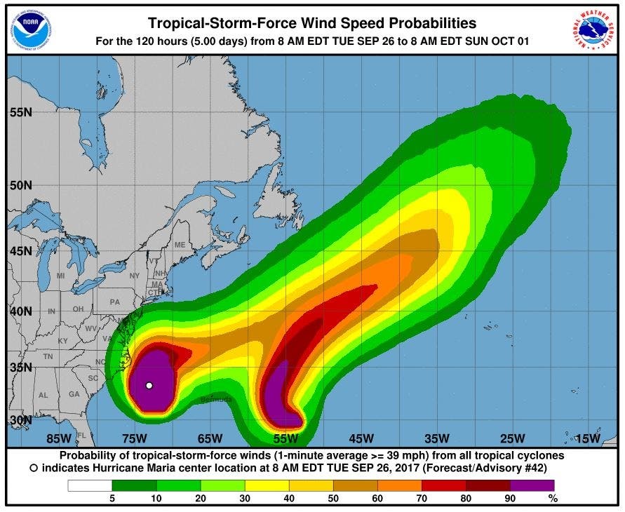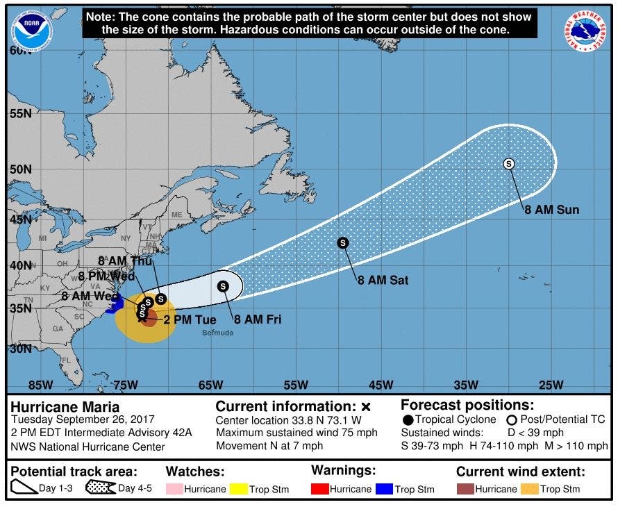 Maria’s trajectory is expected to turn and slow down, ultimately heading back out into the Atlantic in an east-northeast direction by Thursday, forecasters say. “On the forecast track, the center of Maria will pass east of the coast of North Carolina during the next couple of days,” NHS said.