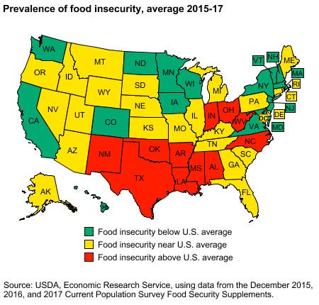 The prevalence of food insecurity is highest in the South and lowest in the Northeast, according to the USDA. In North Carolina, it was above the national average from 2015-17.