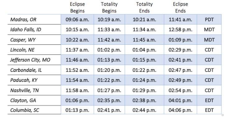 The total solar eclipse will be visible in western North Carolina beginning at 2:33 p.m. in Cherokee, Graham, Swain, Clay, Macon, Jackson and Transylvania counties. All other counties in the state are expected to have a partial eclipse of 90 percent or more.