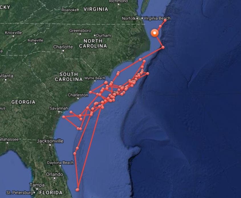 On the morning of July 18, he was tracked about 30 miles east of Nags Head, N.C. Before that, on Friday, July 14, he was tracked about 20 miles southeast of Bald Island, N.C.