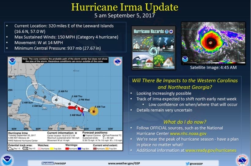 The current trajectory of the storm βlooks increasingly possibleβ that Irma could impact the western Carolinas and northeast Georgia, the NWS said Aug. 5. The weather service stopped short of making projections, saying that while the storm is expected to shift north toward mainland U.S. early next week, the details remain uncertain, and there is low confidence about when and where that will occur.