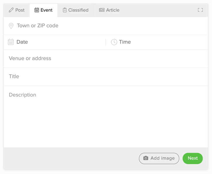 First, in the "Town or ZIP code" field, select the Patch community where you want to post your event.