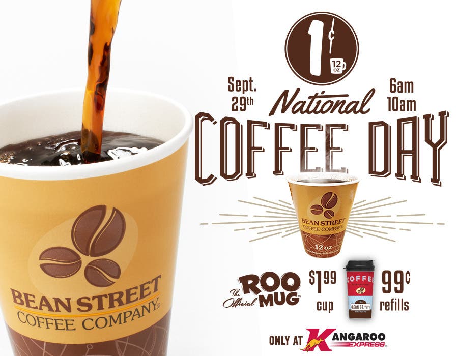 For only one cent, guests will be served a hot, fresh cup of Bean Street Coffee at any Kangaroo Express between 6 a.m. and 10 a.m. on Monday, Sept. 29 (one per guest, while supplies last).