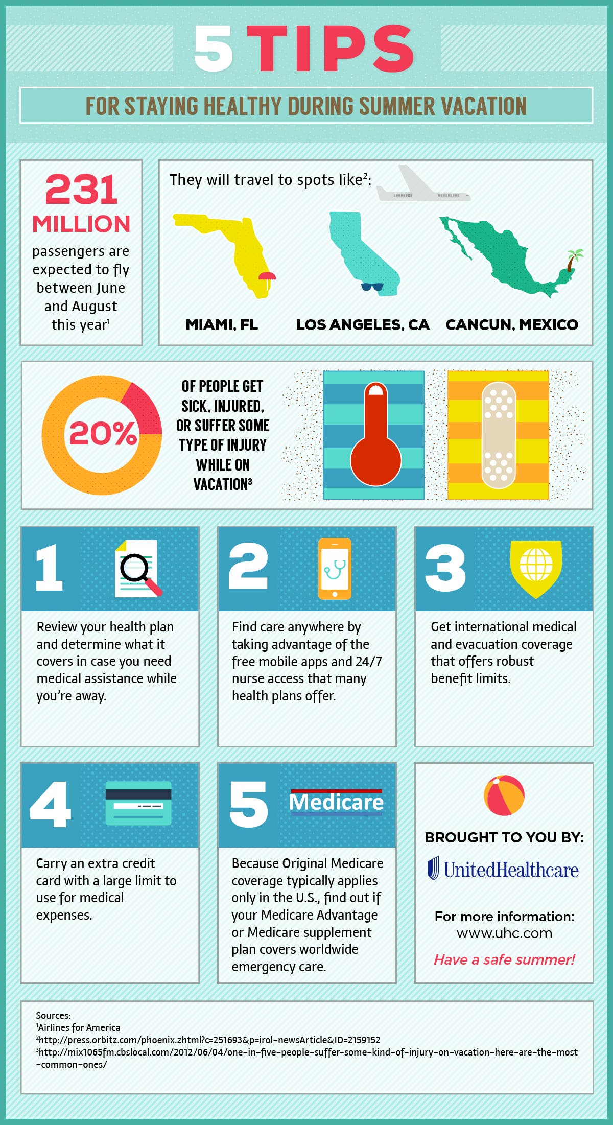However, about 20 percent of people suffer some type of illness or injury while on vacation, the most common of which include food poisoning and car crashes. Before you hit the road or take to the skies, consider these tips to make sure your health, safety and wallet are covered while you’re away: