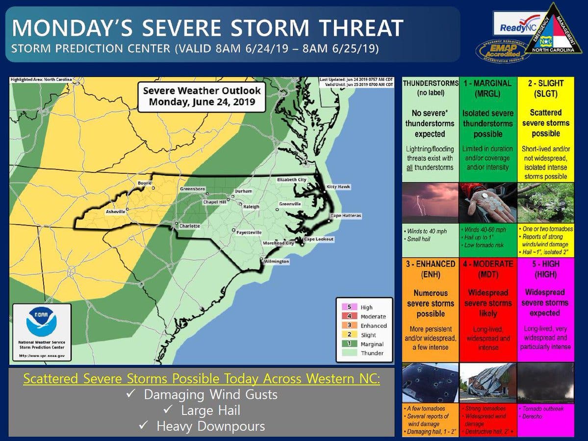 “Numerous thunderstorms are expected to develop across the mountains this afternoon and early evening ahead of an approaching cold front, NWS said in a hazardous weather outlook bulletin Monday morning. “At least scattered thunderstorms should survive eastward across the piedmont through the mid to late evening hours. The primary threat with these thunderstorms will be the potential for damaging wind gusts. Large hail will be a secondary hazard with these thunderstorms, and a brief tornado cannot be ruled out. Any of these thunderstorms will also have the potential to produce frequent cloud-to-ground lightning and locally heavy rainfall.”