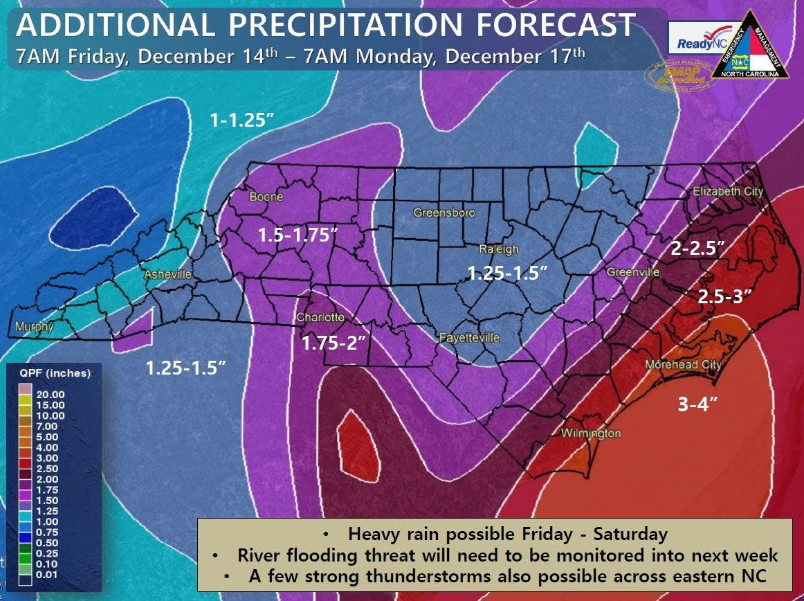 Some areas of North Carolina could see up to three inches of rain, which could lead to minor to moderate flooding of streams and main stem rivers, NWS said.
