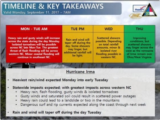HUNTERSVILLE, NC -- North Carolina will begin to see heavy rain and gusty winds Monday reaching up to 43 mph and possibly leading to isolated tornadoes, state officials warned as Tropical Storm Irma continued its westward path through the southeast U.S.