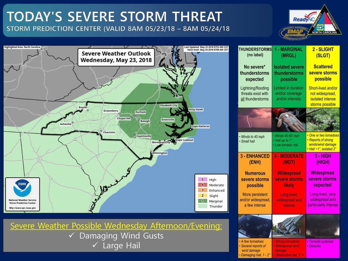 Wednesday’s weather prompted a severe storm threat warning from North Carolina Emergency Management, that said lightning and flooding could be possible in parts of the state, along with winds gusting up to 40 mile per hour and small hail.