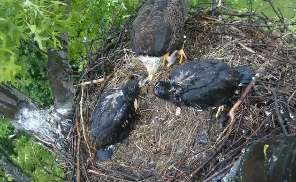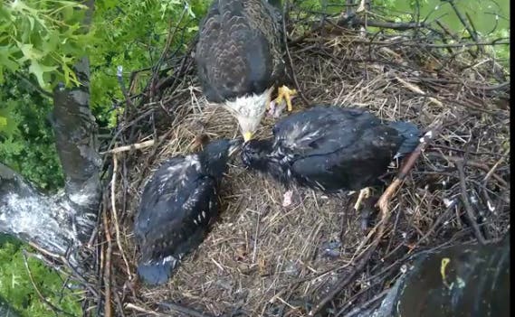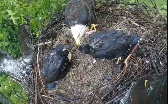 The eaglets, born in April, received their names through a contest at Redwood Elementary School.