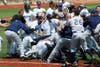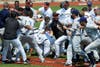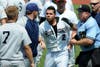 Tempers were as hot as the temperatures, as a melee, sparked by a collision at home plate earlier in the game, stopped the contest for several minutes in the bottom of the third inning.