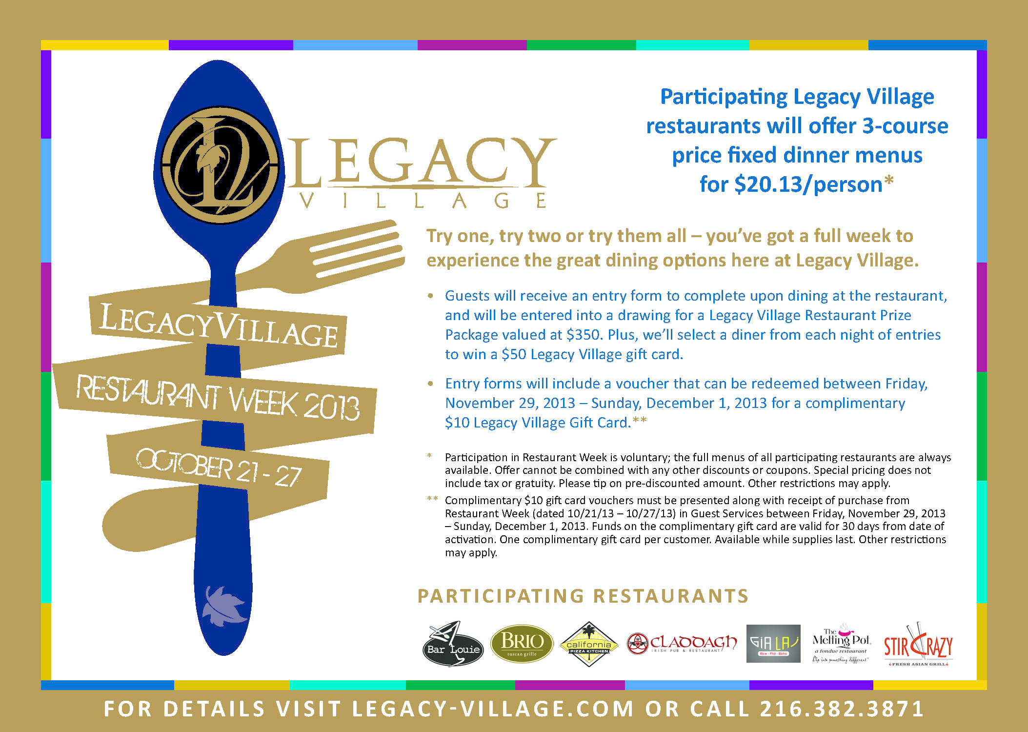 For more information visit http://www.legacy-village.com/fallrestaurantweek13 or call 216.382.3871.