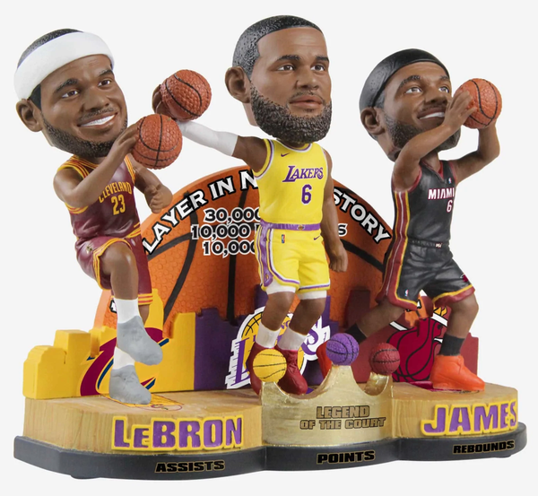 4) Lebron James has a new bobblehead that honors his unique status as the first NBA player to reach 30,000 points, 10,000 rebounds and 10,000 assists. He reached that incredible milestone on March 13. James and Kareem Abdul-Jabbar are the only players in NBA history who rank among the top 50 in all three categories. James, in his 19th NBA season. has played for his hometown Cleveland Cavaliers (twice), the Miami Heat and now the Los Angeles Lakers.