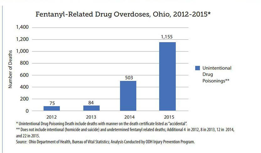Specifically, fentanyl-related unintentional drug overdose deaths in Ohio more than doubled from 503 in 2014 to 1,155 in 2015, according to the Ohio Department of Health. Heroin-related deaths accounted for 1,424 unintentional drug overdose deaths in 2015, an increase from 1,196 in 2014. Heroin was involved in 46.7 percent of all overdose deaths in the state.