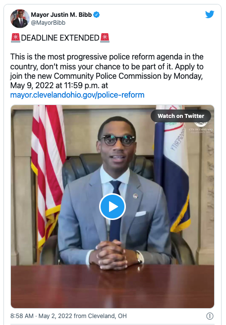 - Today is the deadline to apply for Cleveland's new Community Police Commission. The independent commission will review allegations of police misconduct. Watch Mayor Justin Bibb's video explainer on Twitter.