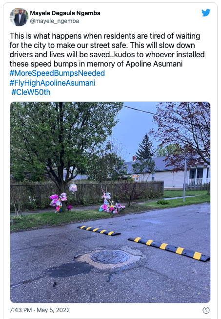 Speed bumps and a caution sign were installed on West 50th Street, near the spot where 5-year-old Apoline Asumani was killed by a reckless hit-and-run driver in April. Only the city of Cleveland didn't install them. Neighborhood residents, working with an anonymous team described as "urbanist guerillas" by Cleveland Scene, did the work.