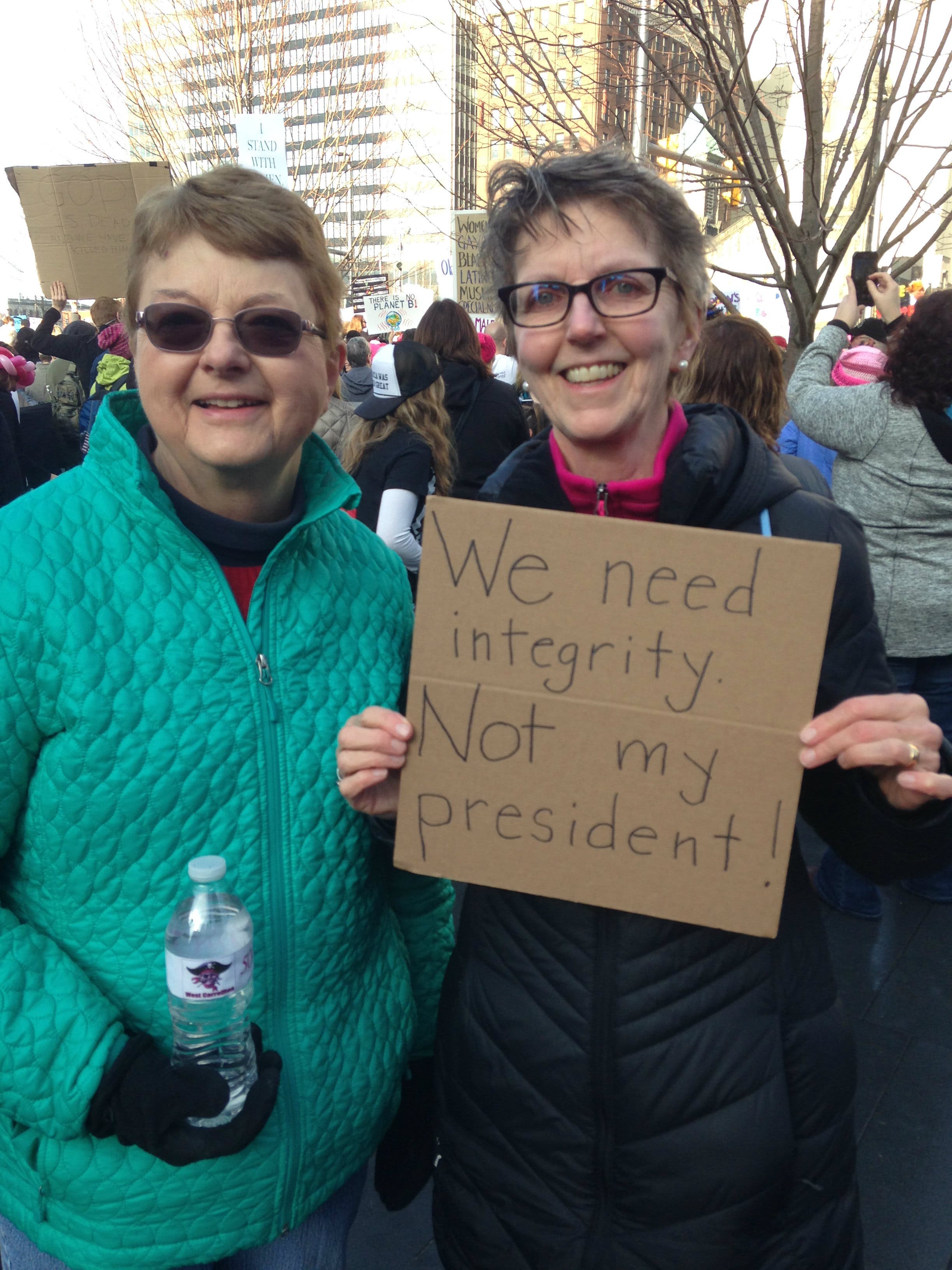 "We want to send a message. We are anti-Trump. We are pro-women," said Judy Coleman and Jan Kinson, who had both driven from the Brecksville-Broadview Heights area to arrive at the protest.