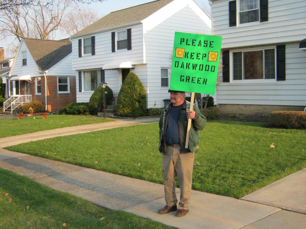 One SNO supporter, Cleveland Heights resident Rick Adorjan, stood outside South Euclid City Hall before the meeting with a green sign that read, "Please Keep Oakwood Green." Adorjan said he's concerned about the greenspace that will be torn up to make way for the development.