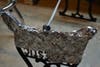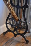 I had an old antique sewing machine base that had been sitting around waiting to be dealt with. Β It was missing bolts and wasnβt very sturdy, so I had pretended I didnβt see it for several weeks before genius hit. Β I decided, instead of keeping it the original size, I would disassemble it and just use the cool pot metal legs.