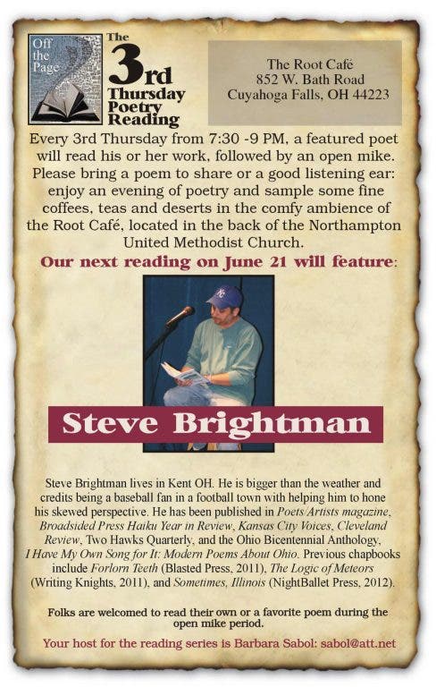 Every 3rd Thursday, a featured poet will read their work, followed by an open mike. Β During that time audience members are welcome to read their own work. Β The featured reader for the month of June will be Steve Brightman.