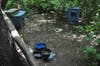 Theyβre in a small wooded area not far from the park entrance, and thereβs ample evidence that the cats are being fed. There are makeshift homes filled with straw for the cats, and plates are scattered around the area, some with uneaten food that looks spoiled.