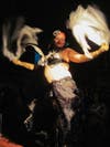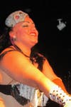 Suggestively removing her elbow-length gloves and waving white fans, Voodoo Baby danced, her spandex outfit full of holes conveying her character.