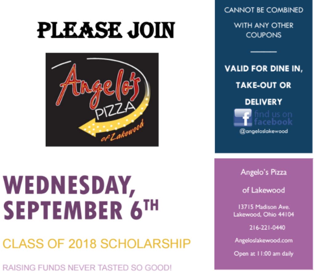 This Wednesday September 6th, the LHS Senior Class has partnered with Angeloβs Pizza to run an fundraiser where whenever a customer mentions the scholarship fund, 20% of their bill will be directly donated. However if you are unable to attend or you are looking to additionally help Lakewood High School, anyone can make this scholarship possible by directly donating to this project. One can visit the Lakewood Rangers Education Foundation website to donate online, or one can mail a check to 14100 Franklin Blvd. Lakewood, OH 44107 making it out to the Lakewood Rangers Education Foundation and writing in the note line Class of 2018 Scholarship. This scholarship will only be possible with the generous donations of Lakewood students, alumni, teachers, residents, and caring individuals. If you have any questions please contact the executive director of the Lakewood Rangers Education Foundation, Terri M. Richards at terri.richards@lakewoodcityschools.org or 216-529-4033.