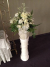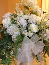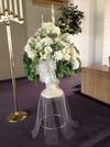 Professionally made white and ivory flower arrangements are available for rent. I will personally set up for your event and remove after the ceremony. Flowers are individually metal pick applied and inserted into foam base. Silk flowers with greenery and ivory tulle. Ivory wired organza bows add to the beauty. Extra tulle will also be provided and wrapped around bases of arrangements to add to the beauty. Rental also includes 10 matching pew bows. Each pew bows is attached with the clear clip and easily slides down on pew. Greenery and ivory tulle surrounds silk flowers. Cascading tulle also available and drapes approximately 30" long.