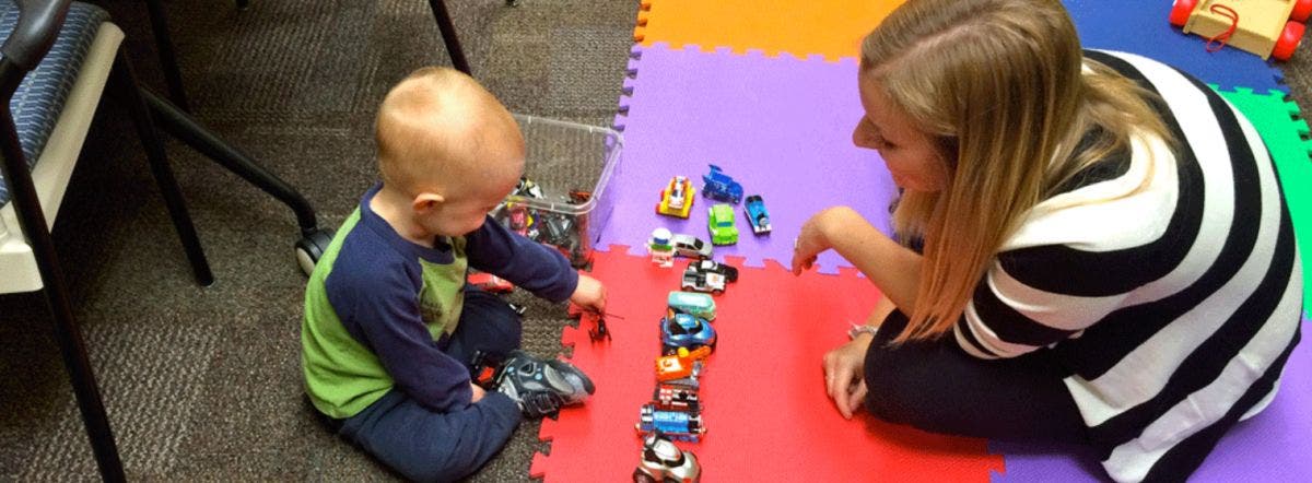 Photo cutline #1: Student in the Speech Pathology and Audiology department works with kid with hearing loss.