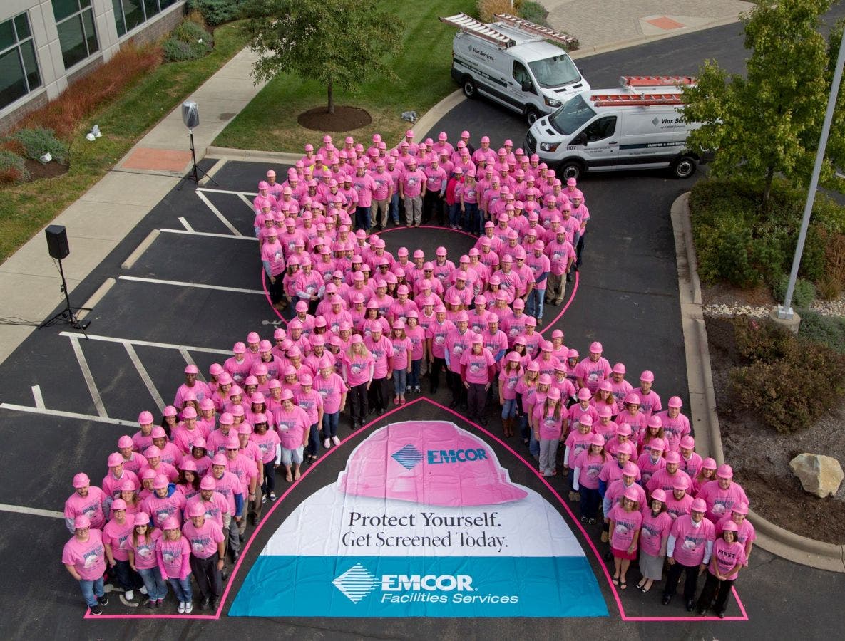 CINCINNATI, OHIO --- October 13, 2016 –– EMCOR Facilities Services, Viox, an EMCOR company, announced today that its company management and employees, along with representatives from clients, doctors from University of Cincinnati (UC) Cancer Institute Breast Cancer Center, and other guests donned EMCOR Pink Hard Hats and assembled to form EMCOR’s signature giant human Pink Hard Hat Ribbon---the first ever to be formed in Ohio---in a “Call to Action” to launch EMCOR’s 8th Annual “Protect Yourself. Get Screened Today.” campaign. The event was held at the national headquarters of EMCOR Facilities Services in Cincinnati, Ohio.