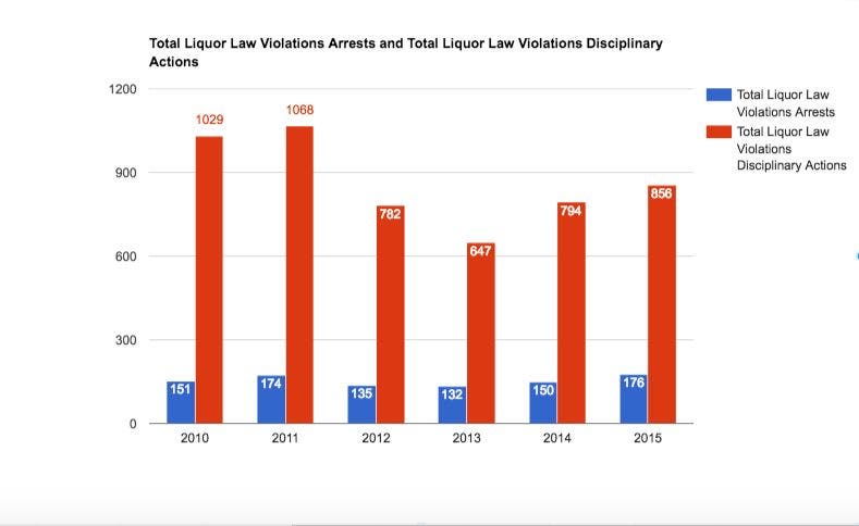 For the third consecutive year, Miami has seen an increase in arrests and disciplinary actions related to liquor law violations.