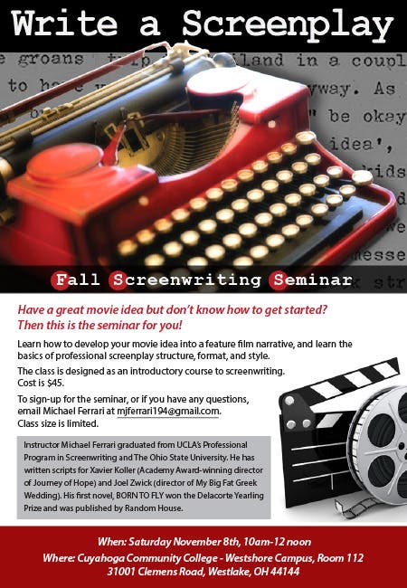 Have a great movie idea but don’t know how to get started? Local author and CSU professor Michael Ferrari is teaching a screenwriting seminar Saturday November 8th 10am-12noon at Tri-C Westshore Campus, 31001 Clemens Road, Westlake.