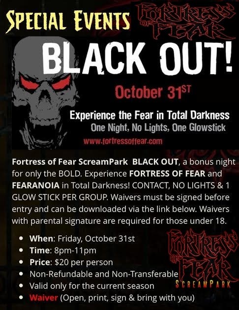 Fortress of Fear ScreamPark BLACK OUT, a bonus night for only the BOLD. Experience FORTRESS OF FEAR and FEARANOIAin Total Darkness! CONTACT, NO LIGHTS & 1 GLOW STICK PER GROUP. Waivers must be signed before entry and can be downloaded via the link below. Waivers with parental signature are required for those under 18.