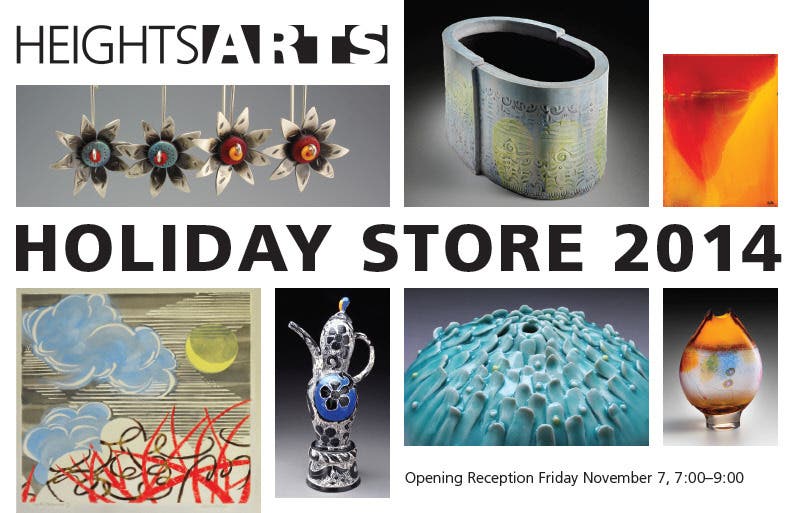 The Heights Arts Holiday Store opens with a members’ preview on Friday, November 7, 6:00-7:00 p.m., followed by an open reception at 7:00-9:00 p.m. The store runs through December 30, with expanded evening and Sunday hours.