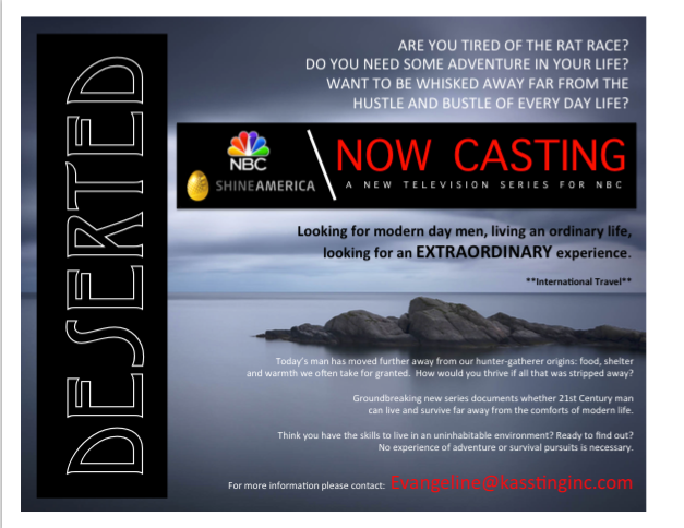 NOW CASTING: A New TV Series for NBC, “DESERTED”!!!