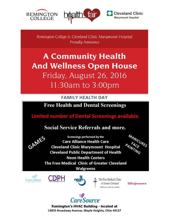 Remington College Cleveland Campus is partnering with Cleveland Clinic Marymount Hospital for a Community Health and Wellness Open House on Friday, August 26 from 11:30 am to 3:00 pm.