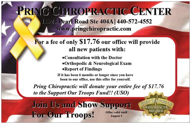 Between now and August 5th new patients can be seen for just $17.76! This is a great time to get started on your path to health and to support our troops. The full fee of $17.76 will be donated to the Support our Troops Fund.